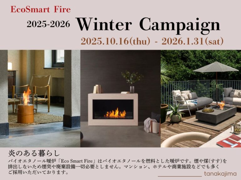 エコスマートファイヤー(エタノール暖炉)ウィンターキャンペーン開催!2025年10月16日(木)〜2026年1月31日(土)/対象商品購入でキャンペーン特典プレゼント+燃料10Lをtanakajimaからプレゼント!