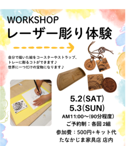 ゴールデンウィーク・木工ワークショップ開催【レーザー体験イベント】 2026・5/2㈯・5/3㈰開催します。