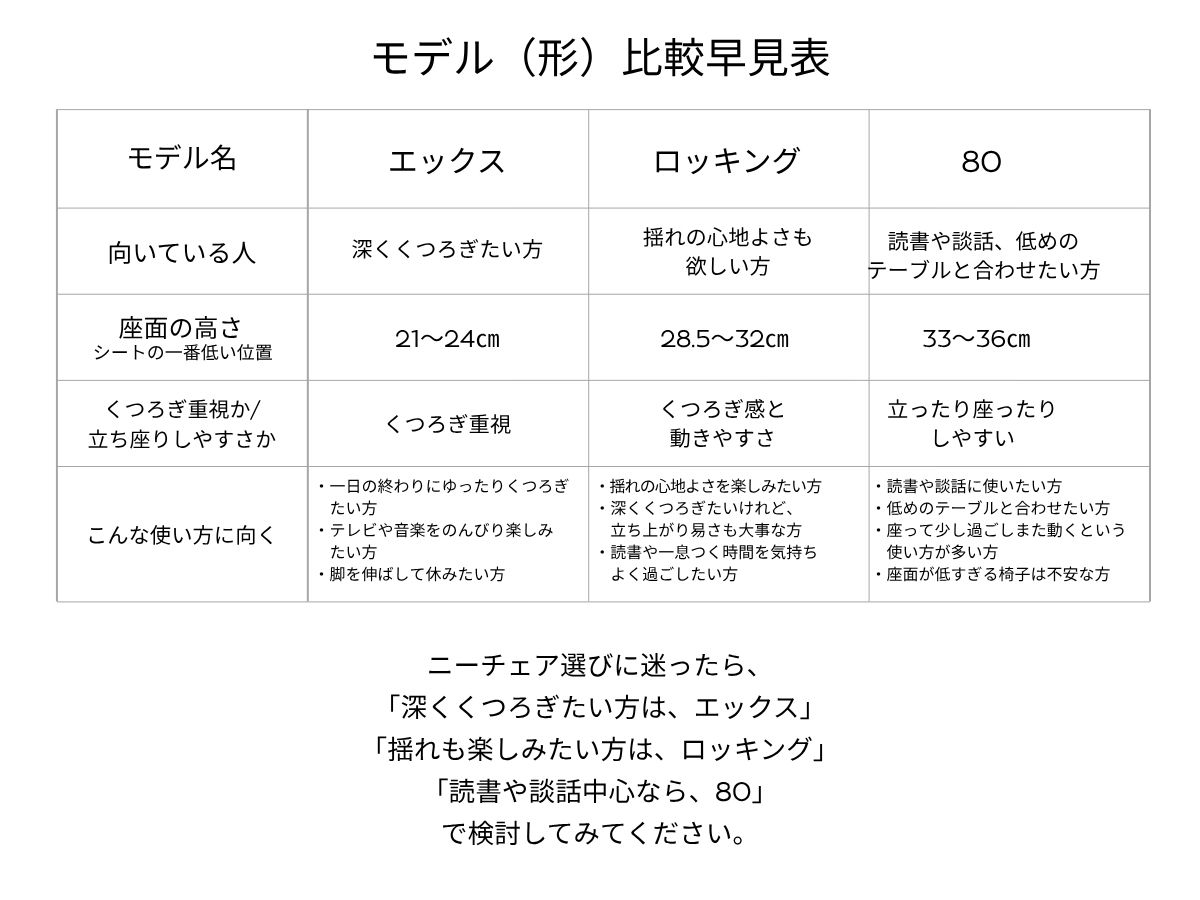 たなかじま家具店(埼玉県熊谷市広瀬490-1)は、埼玉県で唯一の《ニーチェアX》正規販売店です。当店では、ニーチェアXシリーズの4つの形(エックス・ロッキング・オットマン・80)をつでもお座りいただけます。Nychair X(ニーチェアエックス)の誕生は1970年。日本人デザイナー新居猛(にい・たけし)により作られて以来、これまで世界中で55年以上販売されている名作椅子です。住環境など日本的な成り立ちを背景とし、置く場所を選びないシンプルで美しく機能的なデザイン、そして国産ならではの品質とくつろぎは、今もなお世界中で評価され、愛用されています。ニーチェアエックス、ニーチェアエックスシキリ、ニーチェアエックス80、ニーチェアエックスオイルフィニッシュのシリーズがあります。