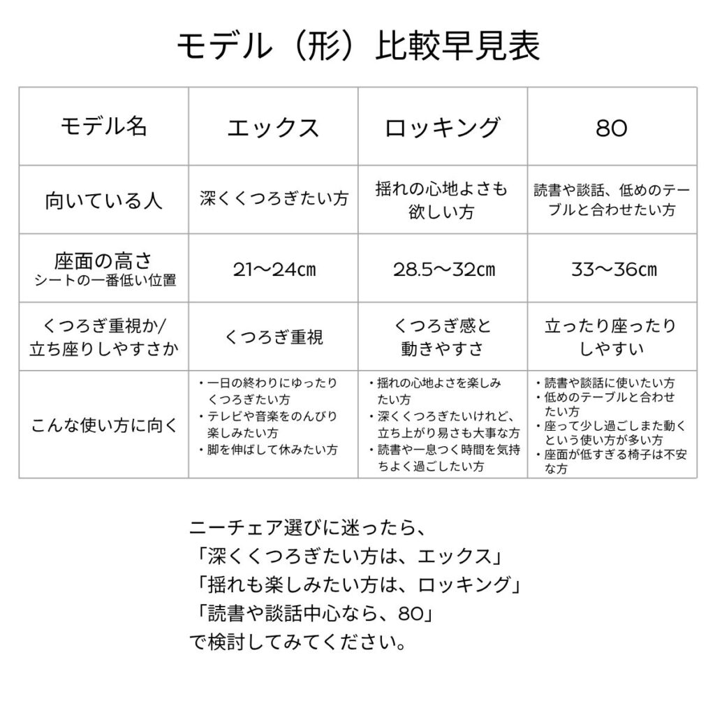 たなかじま家具店では、ニーチェアエックスの4つの形