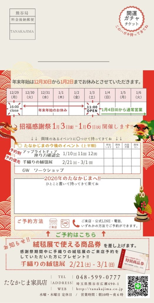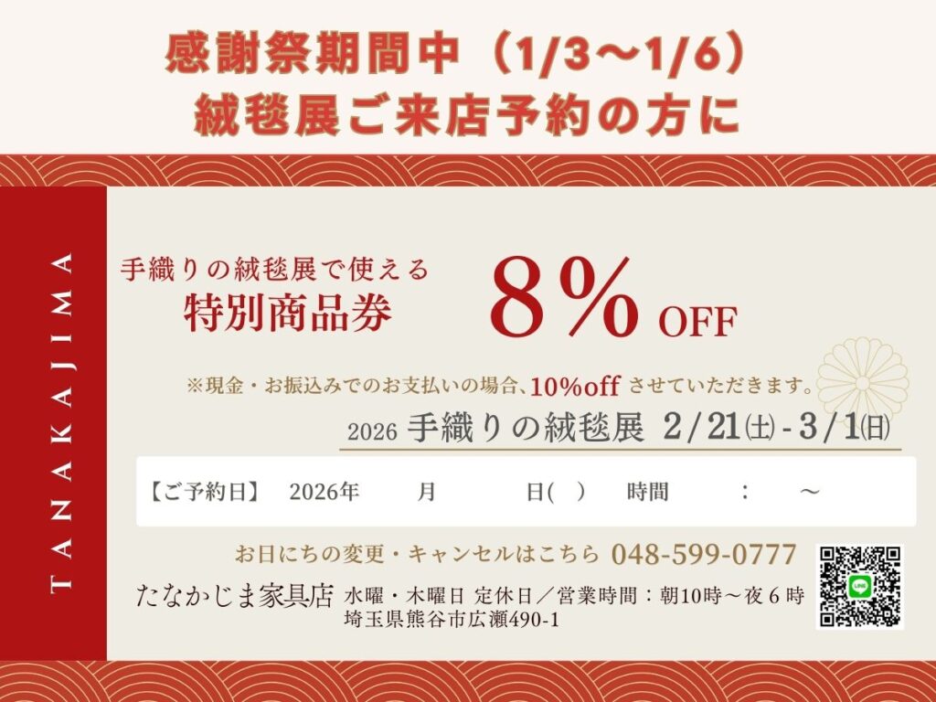 招福感謝祭期間中(1/3㈯~1/6㈫)に絨毯展の来店予約の方に特別商品券を進呈します。