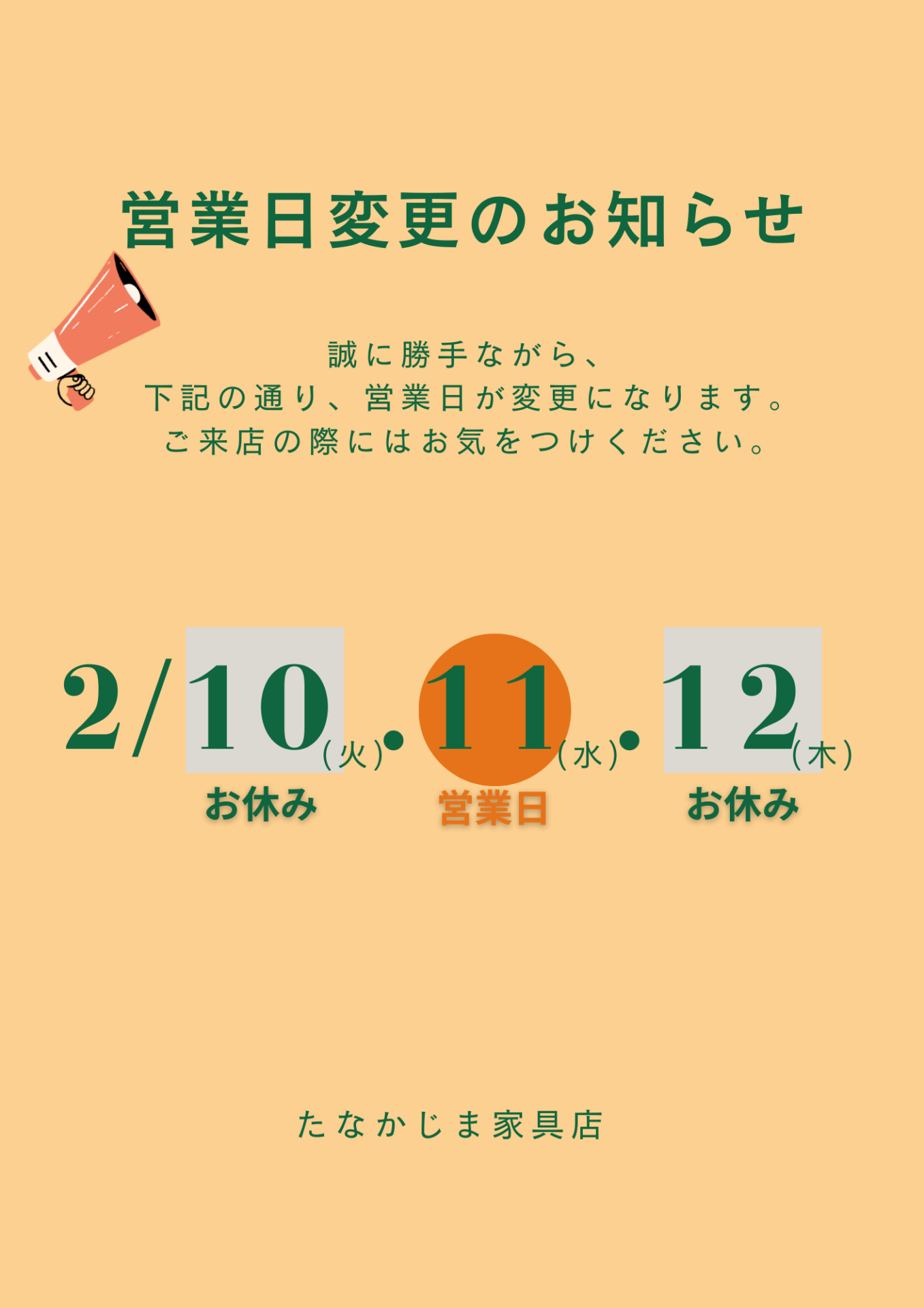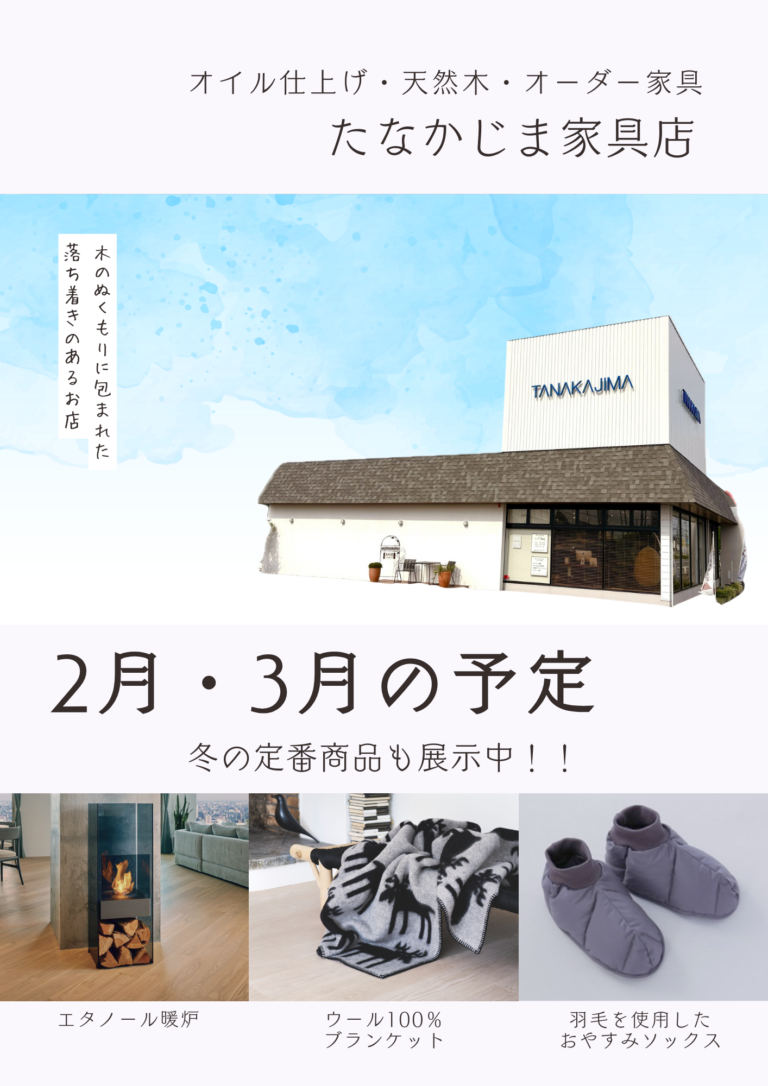 たなかじま家具店では、2月10日(火).12日(木)臨時休業を頂きます。
